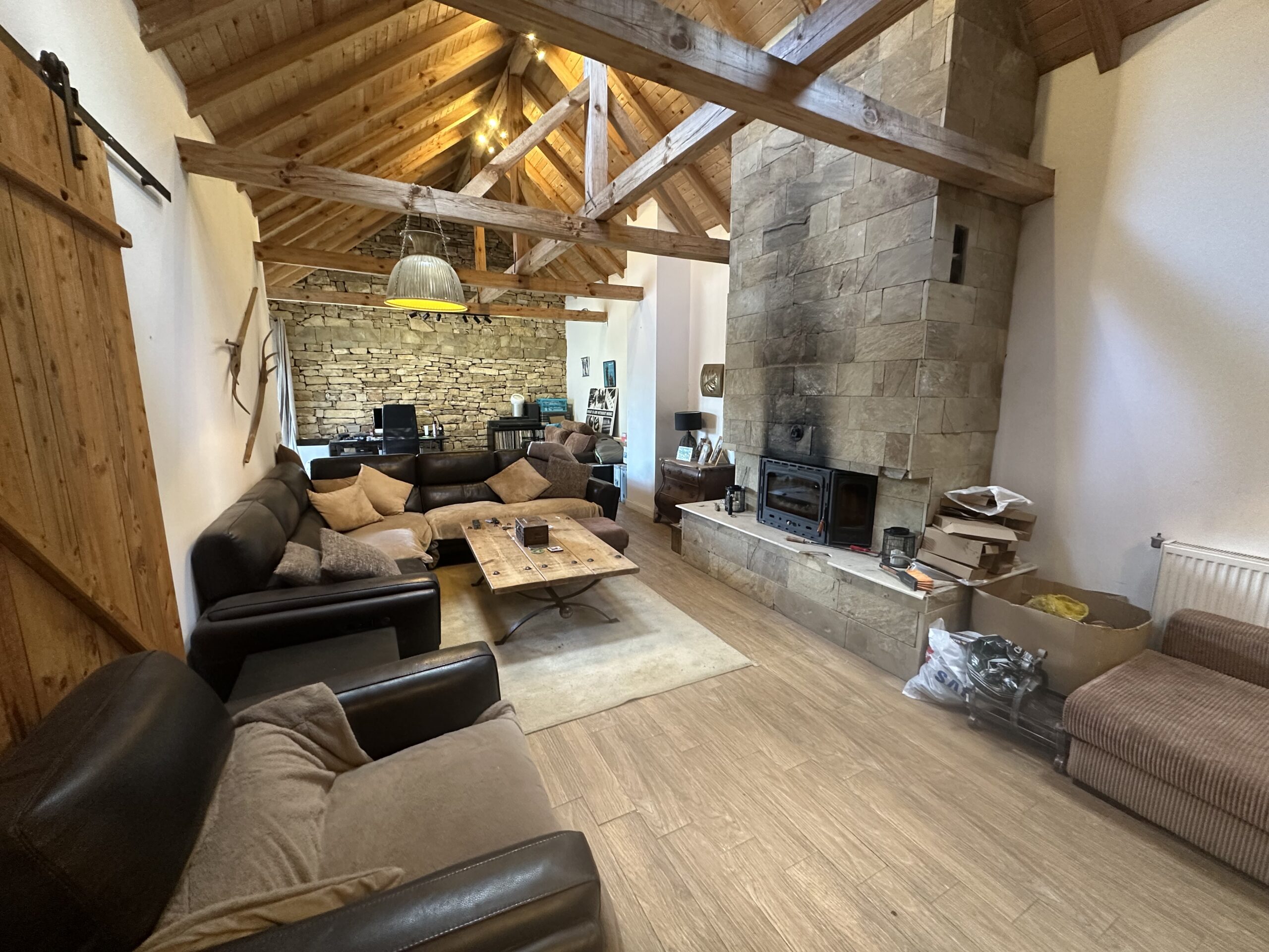 โข Spacious lounge with exposed beams, tiled floors, and a cosy Prity wood burner ๐ฅ